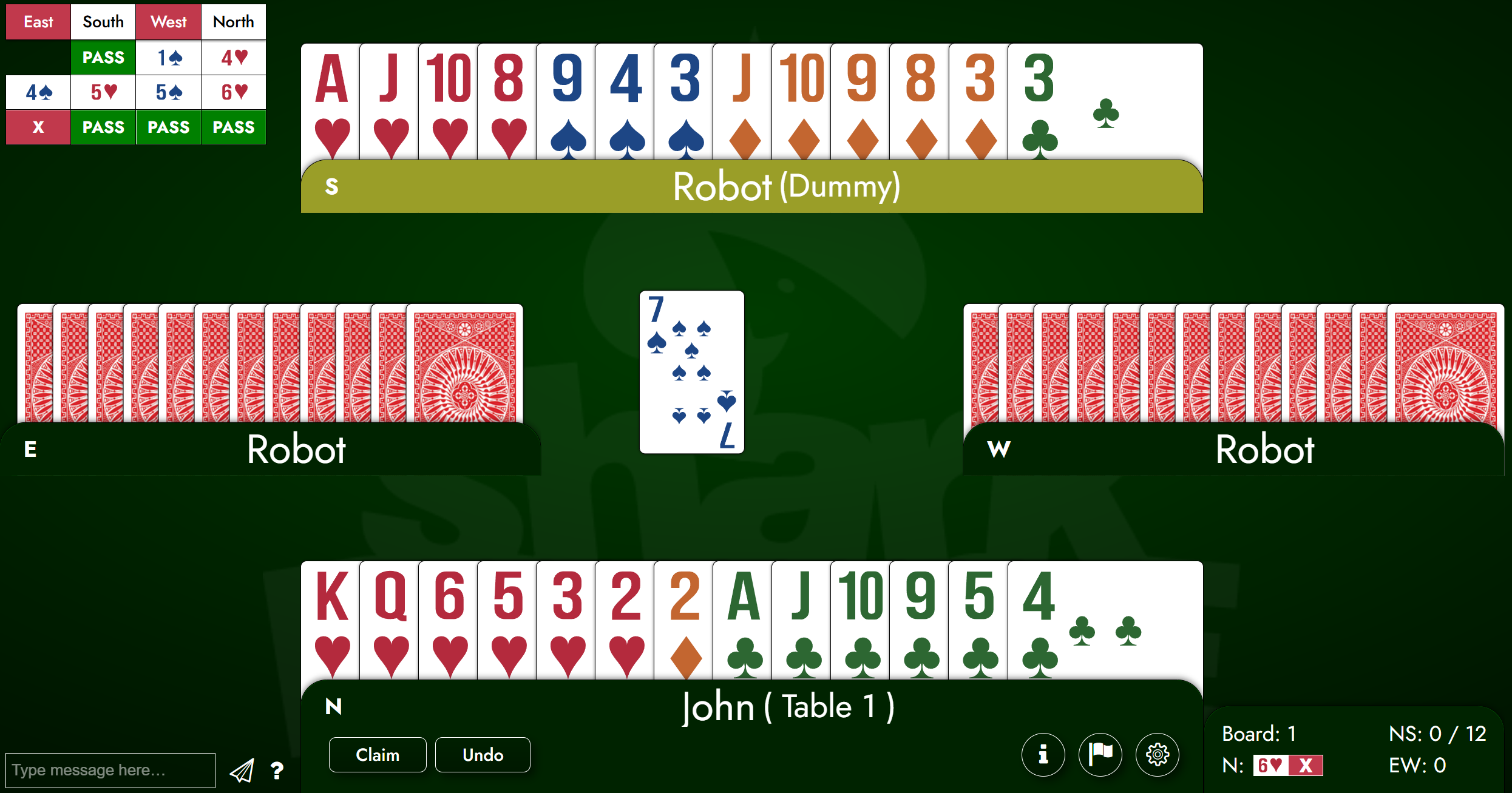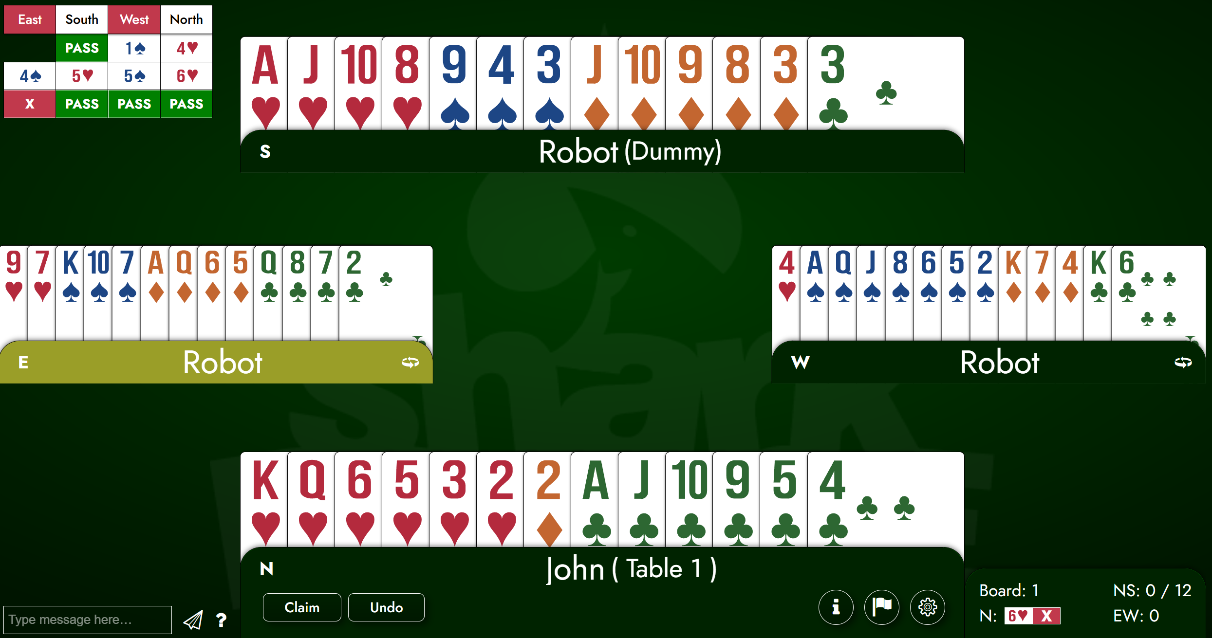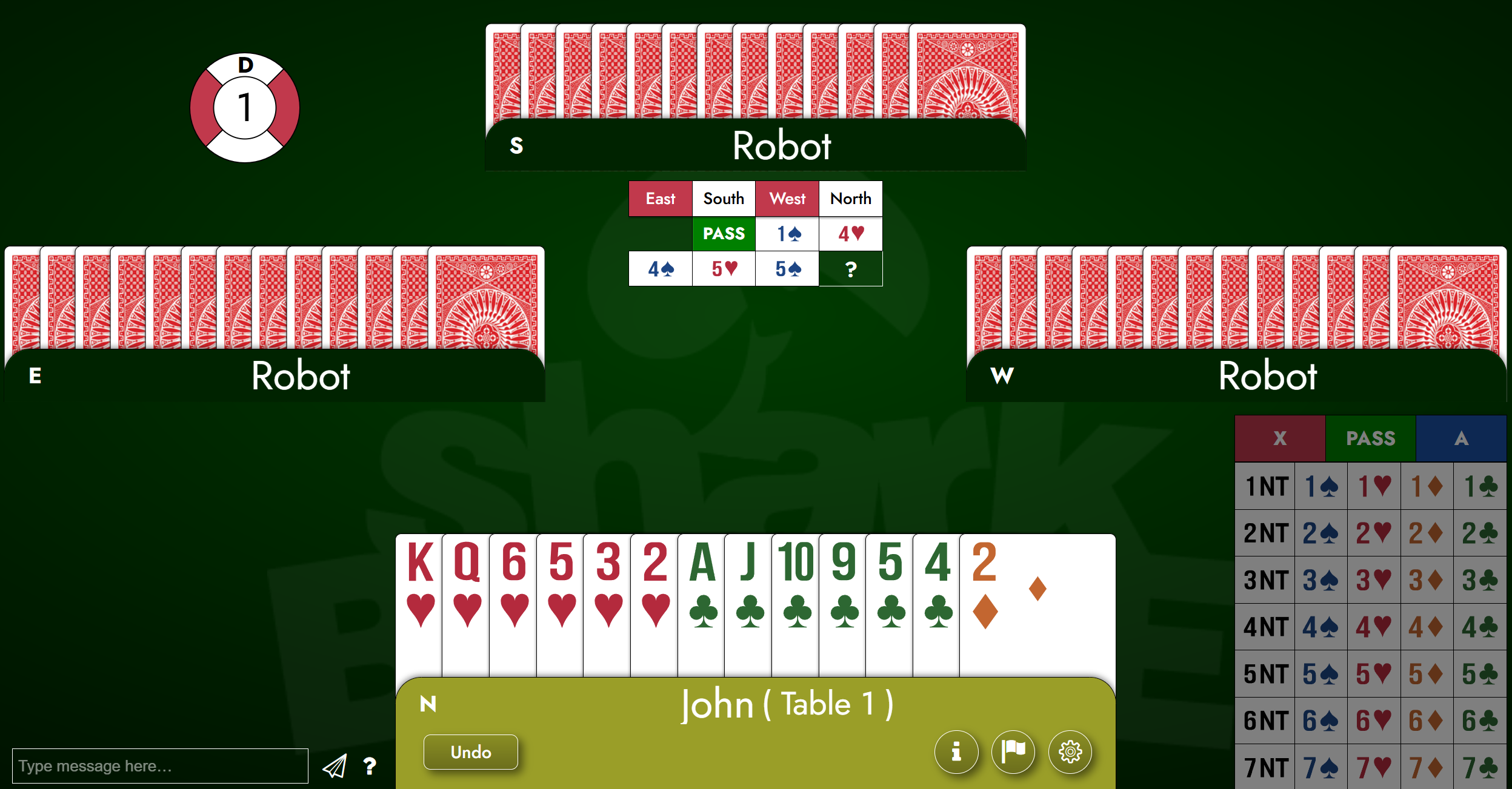 As you can see, my partner passed and my RHO (right-hand opponent) opened 1S. I had some options here. Probably the closest I could get to describing my hand in one bid would be to make a Michaels cuebid; this would show at least 5 hearts and at least 5 in one of the minors. However, I thought that two things were extremely likely: One, given my distribution, the opponents had a spade fit, maybe a big one. And two, they likely had a game. Another factor was the vulnerability; we were not vulnerable and they were. All these combined suggested that I should go for a bid that would take up as much room from the opponents as I reasonably could. I decided to jump to 4H. But wait, you say: Shouldn’t that show an 8- or at least a 7-card suit? Normally yes. But when you have extreme distribution on the side (and check out our upcoming lessons on preempts for more on this subject), that increases your playing strength tremendously, and with more offense, you’re usually safe to preempt at a higher level than your trump suit alone would suggest.